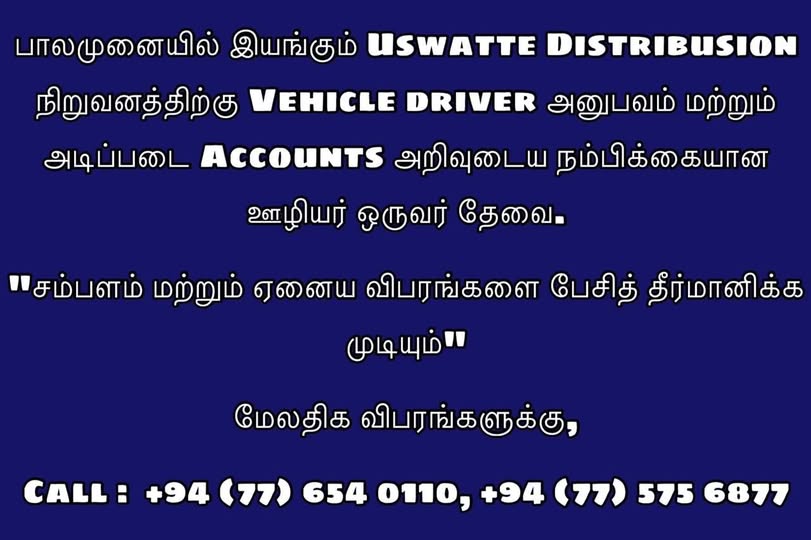 ஆரையம்பதி பாலமுனையில் இயங்கும் Uswatte Distribution நிறுவனத்திற்கு Vehicle Driver அனுபவம் மற்றும் அடிப்படை Accounts அறிவுடைய நம்பிக்கையான ஊழியர் ஒருவர் தேவை.