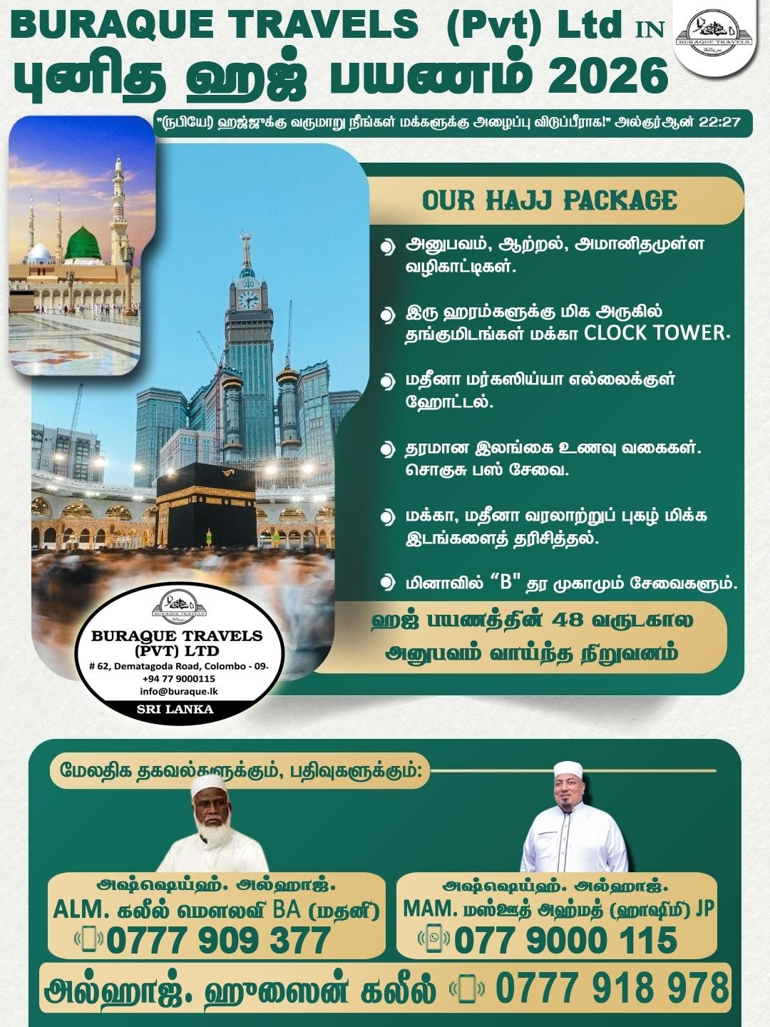 இவ் வருடம் புனித ஹஜ் கடமையை நிறைவேற்ற ஹாஜிகளை அழைத்துச் செல்லவதற்கான ஏற்பாடுகளை Buraque Travels & Tours (Pvt) Ltd மேற்கொண்டு வருகிறது.